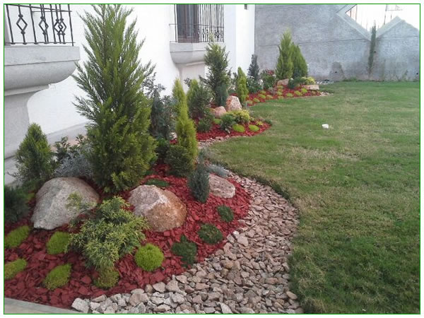 | Con el paso del tiempo, las plantas están creciendo, no hay maleza y el jardín se ve nítido y los Chips de Madera Ladrillo mantienen su vibrante color. |